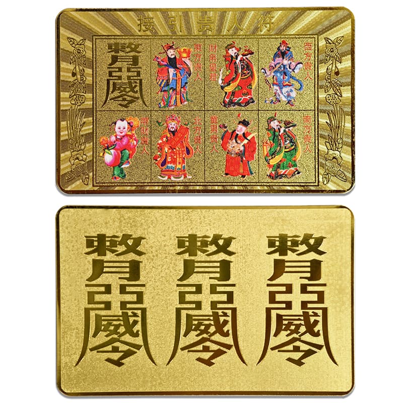 以金色鍍層金屬為基材,通過雕刻與彩色印刷技術呈現神像的圖案,背景加入光茫與花卉裝飾,背面採用壓印技術突出字樣,設計簡潔有力。