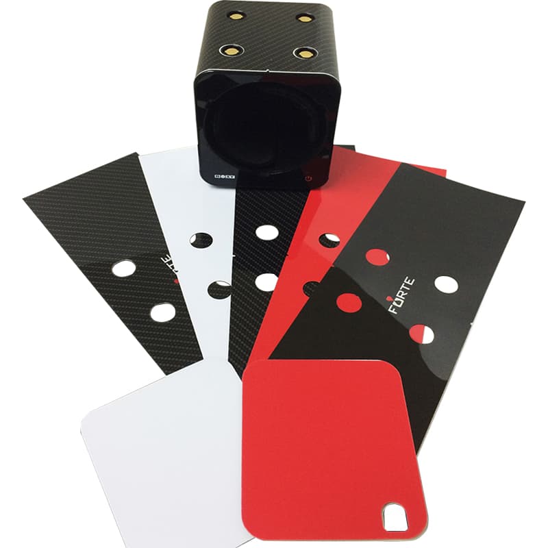 圖中展示了印有碳纖維紋理的黑色、紅色和白色 PC 塑膠薄膜,以及旁邊的黑色小方塊產品。